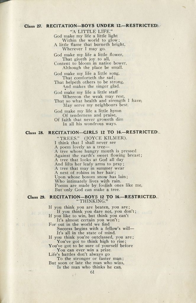 This is the programme for the Sixth Annual Festival of the Manawatū Competitions Society, which was held in the Opera House and Municipal Hall between 6 May and 14 May 1927. The competition categories included elocution (speech and drama), dance and music (both vocal and instrumental). Most entrants were children or young people. In addition to listing the events and names of competitors, the programme features many advertisements for local businesses. This copy belonged to W. Newlands, secretary and treasurer of the society, and includes additional pages and handwritten notes.
