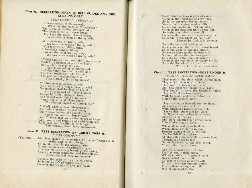 This is the programme for the Sixth Annual Festival of the Manawatū Competitions Society, which was held in the Opera House and Municipal Hall between 6 May and 14 May 1927. The competition categories included elocution (speech and drama), dance and music (both vocal and instrumental). Most entrants were children or young people. In addition to listing the events and names of competitors, the programme features many advertisements for local businesses. This copy belonged to W. Newlands, secretary and treasurer of the society, and includes additional pages and handwritten notes.