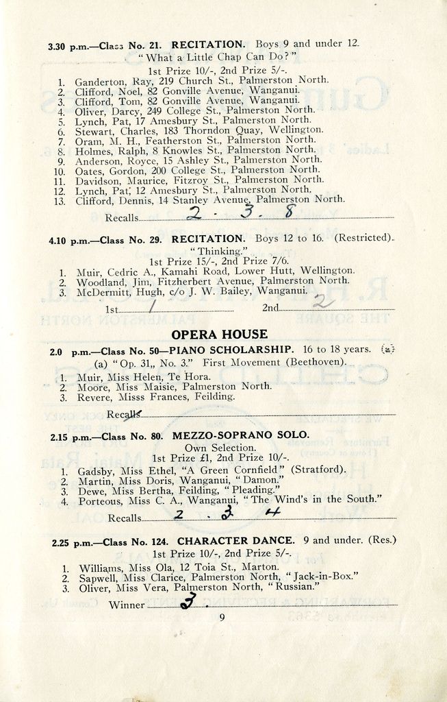 This is the programme for the Sixth Annual Festival of the Manawatū Competitions Society, which was held in the Opera House and Municipal Hall between 6 May and 14 May 1927. The competition categories included elocution (speech and drama), dance and music (both vocal and instrumental). Most entrants were children or young people. In addition to listing the events and names of competitors, the programme features many advertisements for local businesses. This copy belonged to W. Newlands, secretary and treasurer of the society, and includes additional pages and handwritten notes.