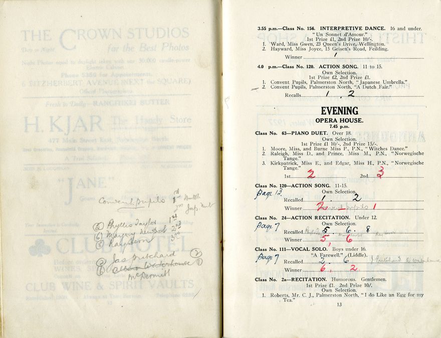 This is the programme for the Sixth Annual Festival of the Manawatū Competitions Society, which was held in the Opera House and Municipal Hall between 6 May and 14 May 1927. The competition categories included elocution (speech and drama), dance and music (both vocal and instrumental). Most entrants were children or young people. In addition to listing the events and names of competitors, the programme features many advertisements for local businesses. This copy belonged to W. Newlands, secretary and treasurer of the society, and includes additional pages and handwritten notes.
