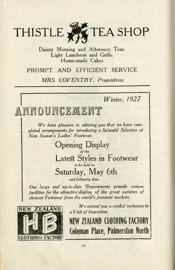 This is the programme for the Sixth Annual Festival of the Manawatū Competitions Society, which was held in the Opera House and Municipal Hall between 6 May and 14 May 1927. The competition categories included elocution (speech and drama), dance and music (both vocal and instrumental). Most entrants were children or young people. In addition to listing the events and names of competitors, the programme features many advertisements for local businesses. This copy belonged to W. Newlands, secretary and treasurer of the society, and includes additional pages and handwritten notes.