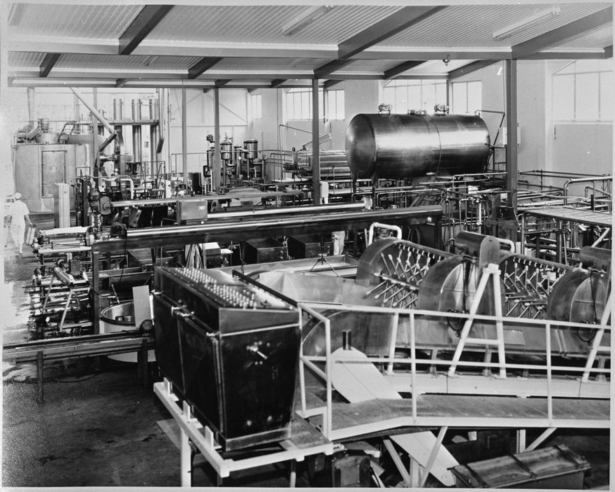 The interior of the Dairy Research Institute showing a variety of different machines used in milk and dairy production.