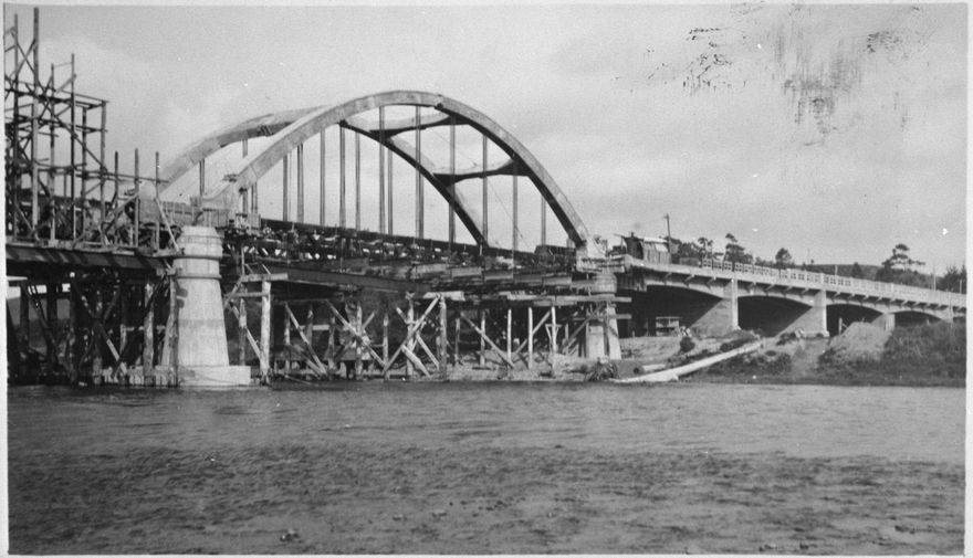 This was the second bridge over the Manawatu River in Palmerston North, replacing the original structure built in 1877. It was constructed by Fletcher Construction and remained until 1986 when it proved too small for the volume of traffic, particularly as it serves the main route to Massey University. This photograph shows the construction of the southern end of the Fitzherbert Bridge.