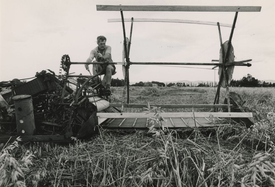 David Ford of Kairanga uses his 1929 'McCormick Deering' reaper and binder, bought and restored in August 1980, for cutting and tying his harvest of oats ready for chaffing.