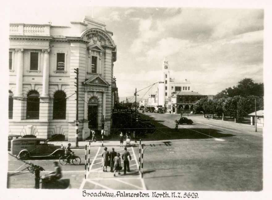 This photograph was created as part of a series of eight photographs showing scenes of Palmerston North. Shown here is Broadway from the Post Office corner of The Square looking down past the T&G Bulding in Broadway Avenue.