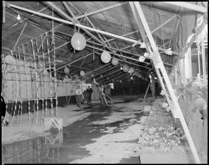 This image was taken for a story that ran in The Manawatu Evening Standard on 09 October 1958: "Cleverly suspended from the iron brackets in the reception hall of the new Standard Brewery these vases of tulips heightened the illusion of the guests, present at today's opening, of being in a garden."