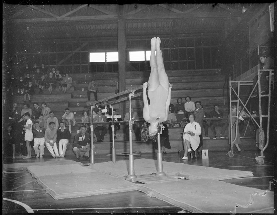 This image was taken for a story that ran in The Manawatu Evening Standard on 23 September 1960 "Miss F. Furness, an Auckland competitor from the Onehunga gymnasium, about to compete in the parallel bars section of the New Zealand gymnastics championships being held at the Y.M.C.A. Stadium today and tomorrow."