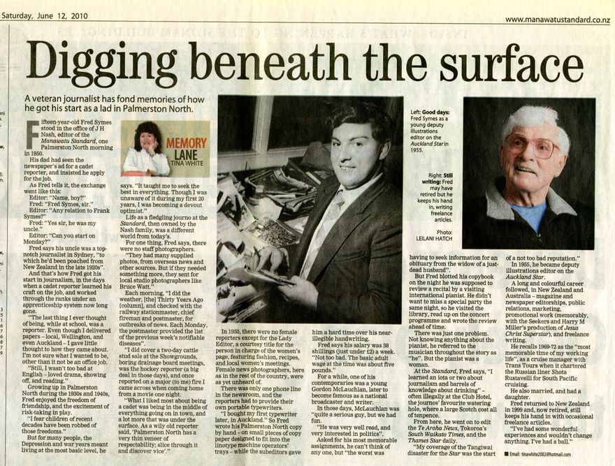Journalist Tina White's weekly "Memory Lane" article in the Manawatū Standard. Fifteen year old Fred Symes started working as a cadet reporter for the Manawatū Standard in 1950. It was to be the start of a long and colourful career in New Zealand and Australia in newspapers, public relations, marketing, promotional work and freelance writing.