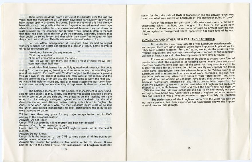This booklet outlines industrial disputes at the Longburn freezing works during the 1970s, specifically: disputes over operating temperatures at extremes of both heat and cold; disagreements between workers and management over the roles of foremen and leading hands; pay disputes; and general working conditions and workloads.
