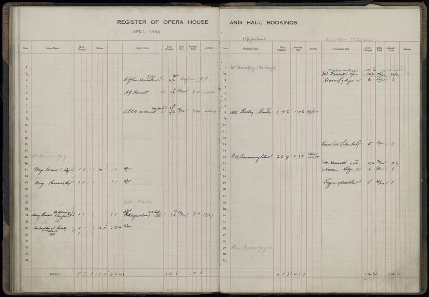 Municipal Opera House and Coronation Hall, Register of Bookings