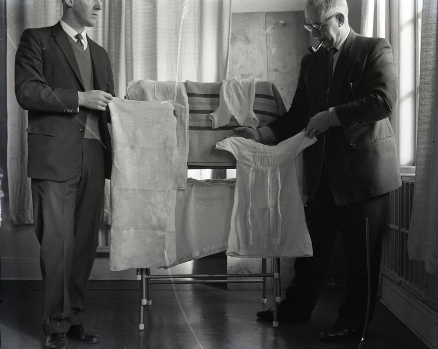 This image ran in the Manawatu Evening Standard on July 12 1962 with the caption, "Clothing left with the 10 to 20-day-old baby boy early yesterday morning was found in good condition. Photograph shows Senior-Detective-Sergeant F A Gordon holding some of the articles at present being held at the police station. The police have found no significant marks on the clothing." This baby, dubbed "Bobby" by hospital staff, was discovered by Palmerston North milkman Trevor Roberts in a phone-booth near the corner of Cardiff Street and Pioneer Highway. The mother was never found and "Bobby" was adopted out under the name Keith Mitchell, who never discovered the identity of his birth parents. For further information, see "Phonebox Baby's Unanswered Questions" by Tina White in the Manawatu Evening Standard, 28 November 2015.