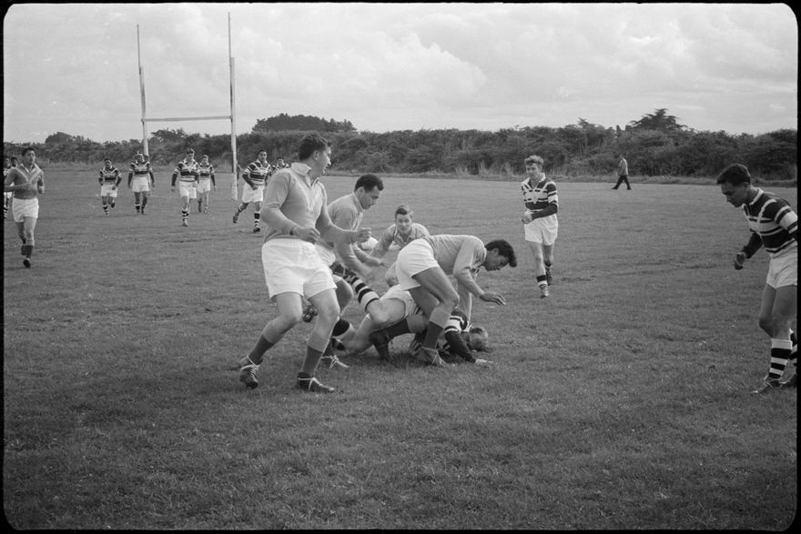 Caption: “Rugby League at Coronation Park. Palmerston North A tussle between Kia Ora B and Celtic.”