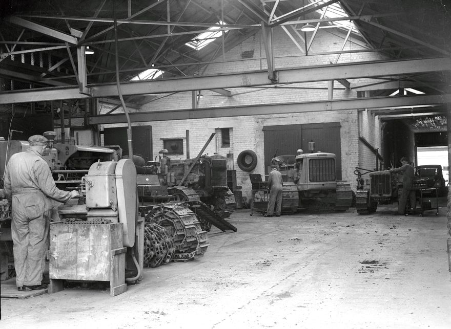 Tractors under repair in an engineering workshop, thought to be Gough Gough and Hamer, located at 157 Rangitikei Street.