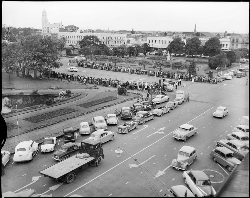 This image was taken for a story that ran in The Manawatu Evening Standard on 27 October 1958: "On Saturday last the Manawatu Car Club held a North Island rally. At the completion of the rally a test of driving at speed in and out posts was held in a portion of the Palmerston North Square. This view shows cars waiting their turn and the crowd watching one car go through the course.