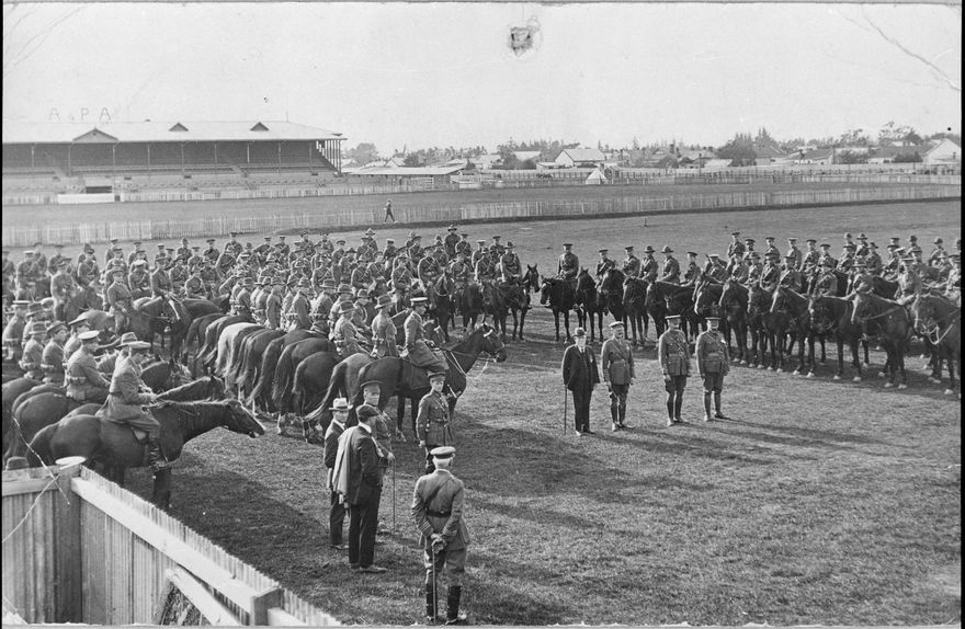 Long-service medals being presented to Captains Morrison, Smith, Batchelor and G.M.S. Reid at the Mounted Rifles camp held in the Showgrounds. The 6th (Manawatu) Mounted Rifles was formed on March 17, 1911. They were mobilised during the Great War as a squadron of the Wellington Mounted Rifle Regiment.