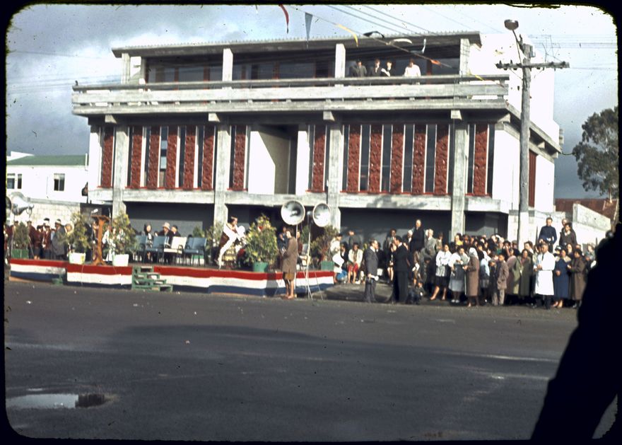 The Māori Battalion Hall, named 'Te Rau Aroha' (emblem of gratitude), was erected in Palmerston North as a national memorial to the men of the 28th (Māori) Battalion who lost their lives in the Second World War. It was designed by John Scott, architect of Hastings, and the 14 carved panels on the facade (8 feet x 1 foot 6 inches) were carved by Kelly Kereama of Feilding. Inside 639 names of those who did not return are inscribed on 14 brass plates. All the concrete, both inside and out, was left unplastered and with the marks of the boxing to symbolise the strength of the Māori people. The three-storey building was planned as a community centre to serve all races and was opened in June 1964 by the Governor General, Sir Bernard Fergusson. Mayor Gilbert Rennie was also in attendance, as well as a number of Māori veterans.