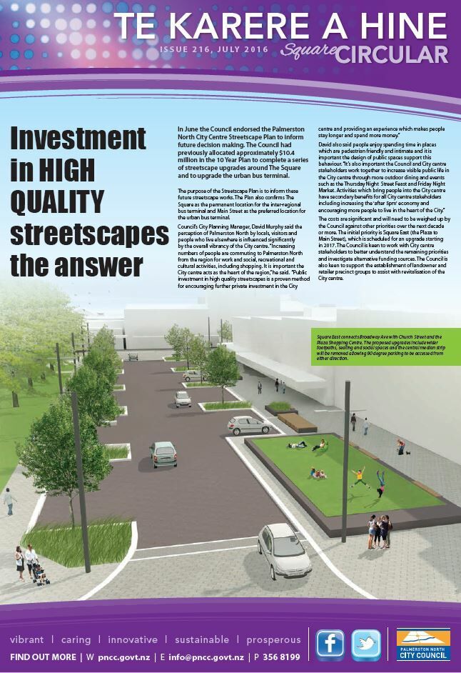 The Square Circular was Palmerston North City Council's monthly community publication, informing Palmerstonians of PNCC initiatives, activites, and events. This month's issue includes: Streetscape plan; Wildbase Recovery Centre; annual plan; online forms; parking; sustainability strategy; elections; scholarships; public consultation; councillor contact details; council meetings.