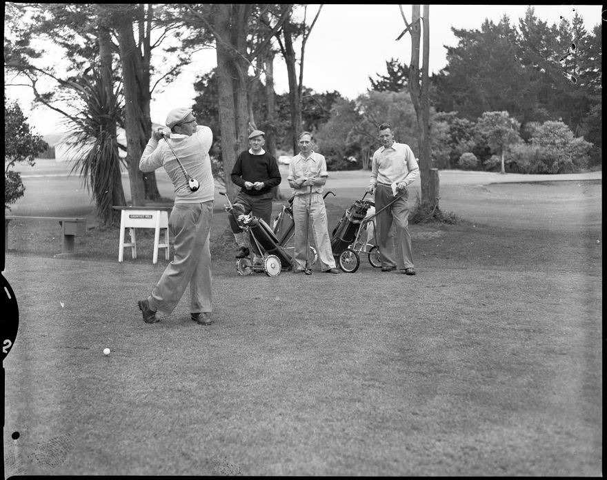 This image was taken for a story that ran in The Manawatu Evening Standard on 25 October 1958: "The main interest of golfers in the city this weekend is at the Manawatu Club's tournament at Hokowhitu. J. Sims (Palmerston North) is seen driving off watched by R. Legge (Eketahuna), W. Dimes and F. Cree (Wellington)."