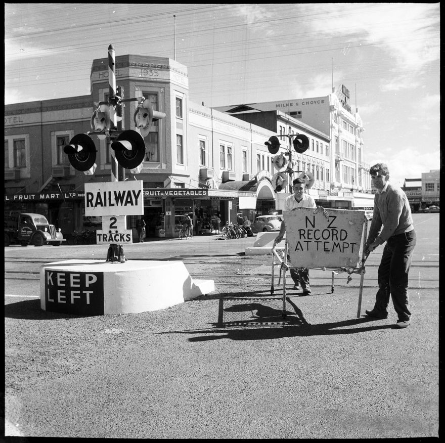 This image was taken for a story that ran in The Manawatu Evening Standard on 11 April 1961 "How many times can ten men push an iron bedstead around the Square in 16 hours. When photographed yesterday the students announced they were on their 91st circuit; they intended stopping on the 100th lap. Starting at 8 o'clock on Sunday evening, the students were divided in five teams, each having one hour pushing and pulling the bedstead. They found the railway crossing the hardest part of their trek as the castors kept coming off the frame."