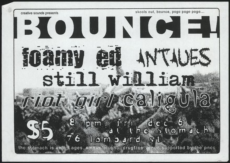 Creative Sounds presents: Bounce! Skools out, bounce, pogo, pogo, pogo. Foamy Ed, Antaues, Still William, Riot Girl, Caligula. $5. 8pm fri dec 6 at the stomach. 76 Lombard st. The Stomach is an all ages alcohol/drug/smokefree venue supported by the PNCC.