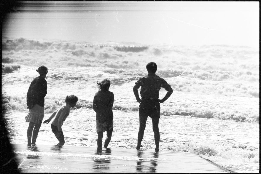 [Image of the only people at Foxton Beach yesterday afternoon were these four, who braved gale force winds and walked to the beach to watch the huge waves pounding in.]