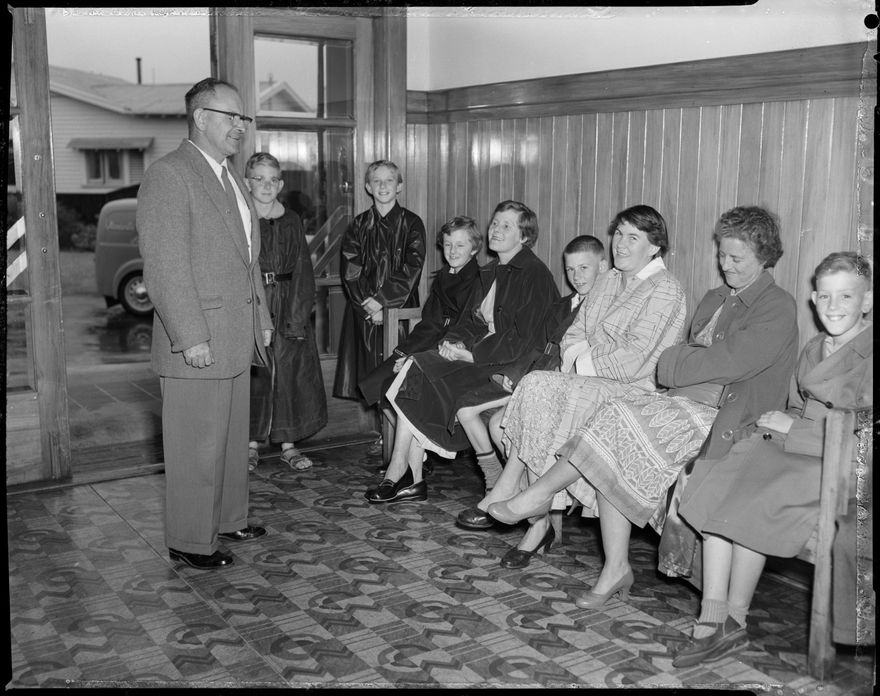 This image was taken for a story that ran in The Manawatu Evening Standard on 30 January, 1959. "Starting at another school is just another facet in the process of growing up. Mothers and children gathered at the Palmerston North Intermediate Normal School today where they met the headmaster, Mr B. G. Jackson (left) and the children were enrolled for their intermediate education."