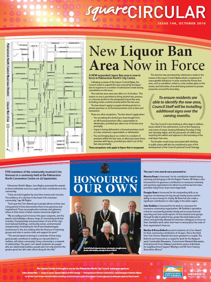 The Square Circular was Palmerston North City Council's monthly community publication, informing Palmerstonians of PNCC initiatives, activites, and events. This month's issue includes: Liquor Ban; Te Manawa; Art; Events; Public Art; Civic Awards; Athletics; Performing Arts Trust Scholarship.