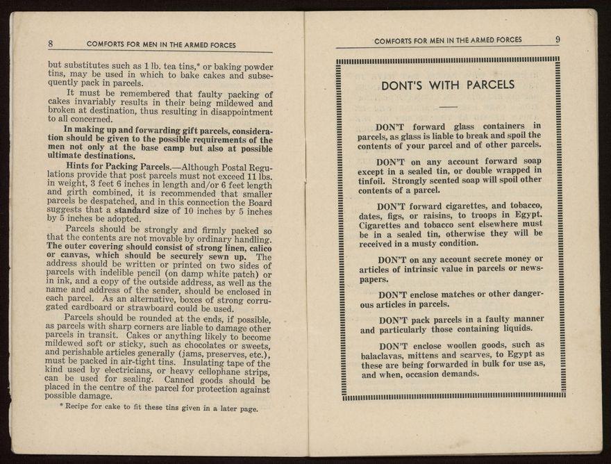 Book issued by the National Patriotic Fund Board outlining details of acceptable gifts for those serving overseas in World War II, and how to despatch the goods to them.