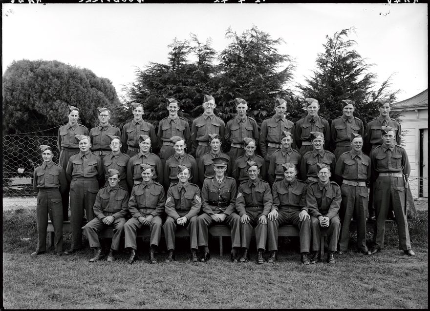 A group of Army personnel taken at the Woodville camp. Many Hawkes Bay regiments spent time in training at the Woodville racecourse.