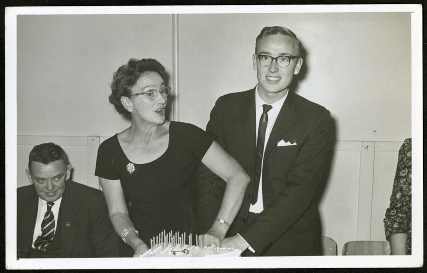 Betty and Tony cut the cake at Tony's 21st birthday celebration in april 1963, while Tony's father Jack looks on. Jack and Betty married in 1936 and had a family of four boys. They were early and long term residents of the Savage Crescent state housing precinct, living at 5 Mansford Place.