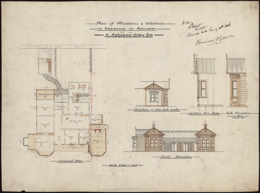 This plan for alterations to 'Waiwiri', a single-storey house, was designed by L. G. West for Arthur Acheson-Gray of Ashhurst. The Danish-born architect Ludolph Georg West (1846-1919) established an architectural practice in Palmerston North in about 1880. In 1912 he formed a partnership with is son, Ernest Vilhem West, who continued the business after his father's death.