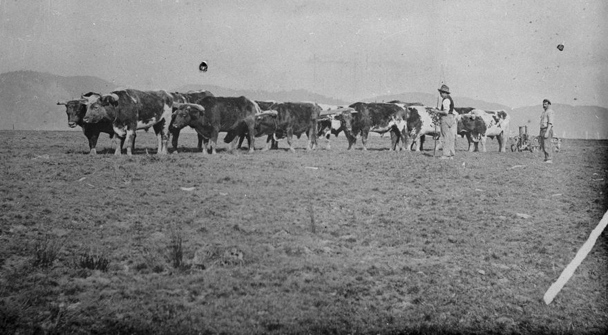 A team of twelve bullocks at work on the site of 'Miranui' flaxmill near Shannon. This team was probably used for stumping and ploughing the land, which was then used for fibre drying.