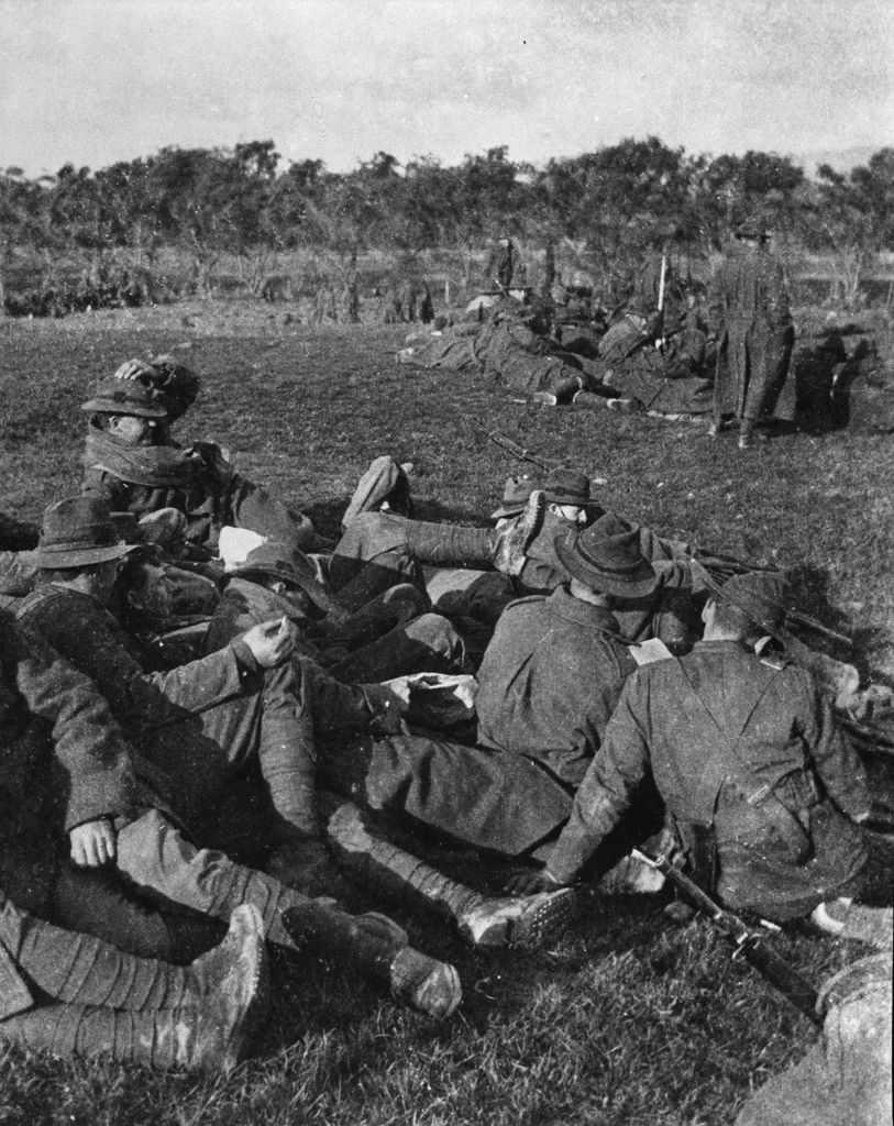 Members of the New Zealand Rifle Brigade taking a break from training.