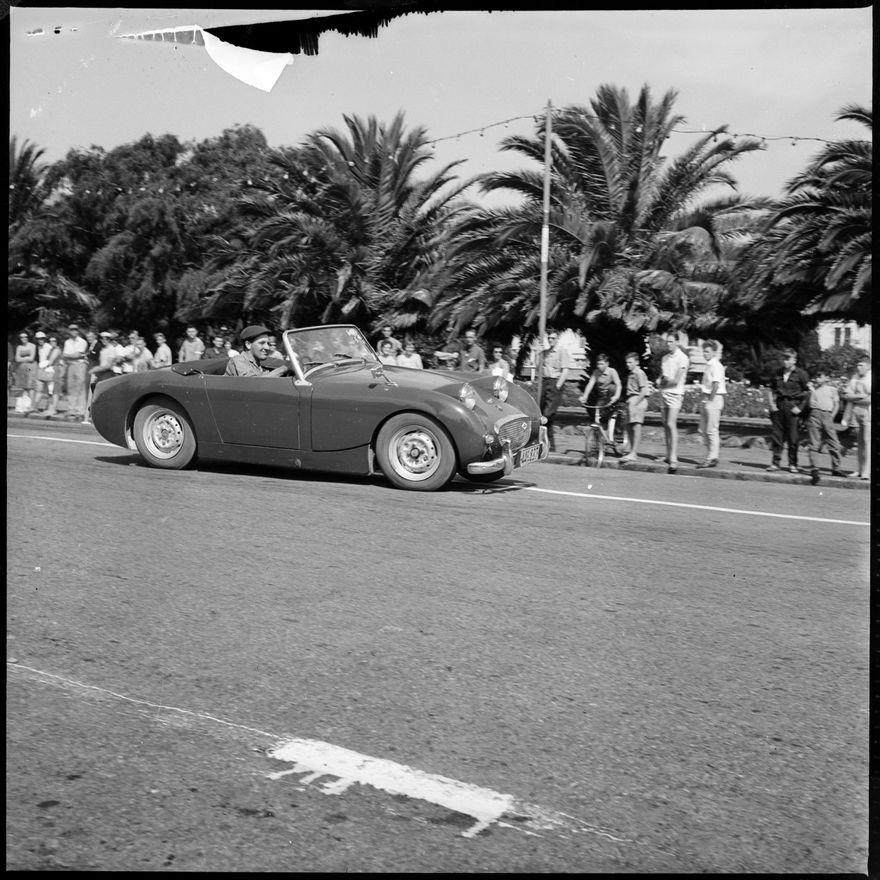 This image was taken for a story that ran in The Manawatu Evening Standard on 26 January, 1964. "M. K. Knowles (Wairarapa), driving an Austin Healey Spright, recorded the fastest time of 19 4-5sec in the wiggle woggle competition at the Manawatu Car Club's gymkhana on Saturday."