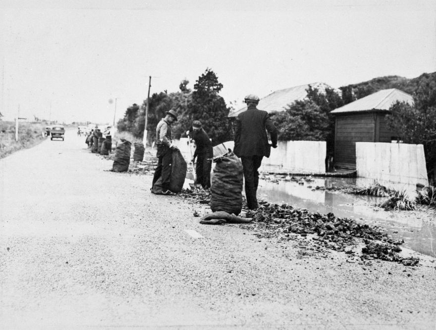 Council workers rebag coke, swept away from the Gasworks in the flood.