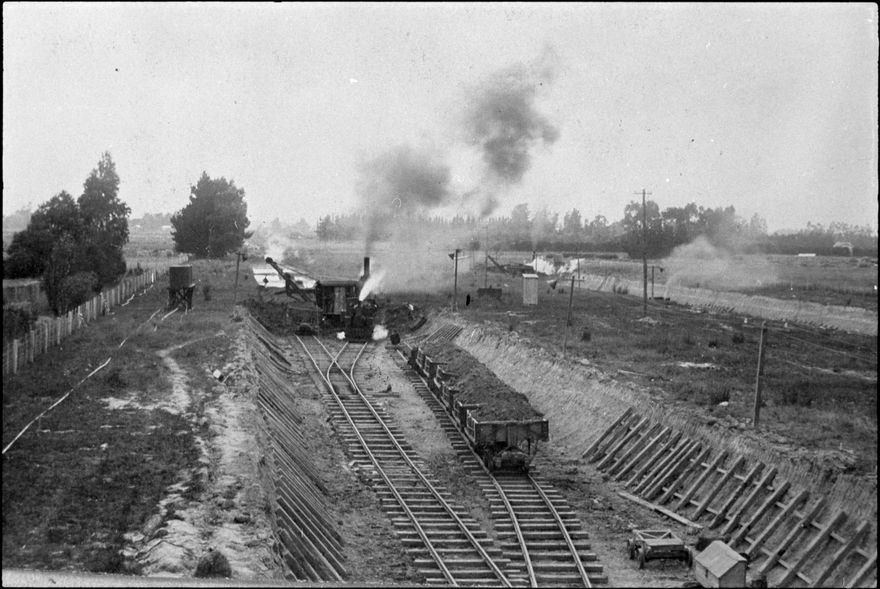 Steam shovels at work on the Milson railway deviation in 1928, looking east from the newly completed overbridge on Milson Line. the deviation of the railway to around the outskirts of Palmerston North began in 1926 and was completed in 1959.