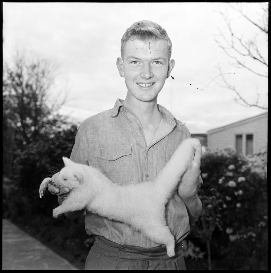 This image was taken for a story that ran in The Manawatu Evening Standard on 27 April 1961 "A young white opossum trapped by Leonard Miller in Folson's Bush at Aokautere, last night. This type of opossum is quite rare, and, although white, is not an albino."