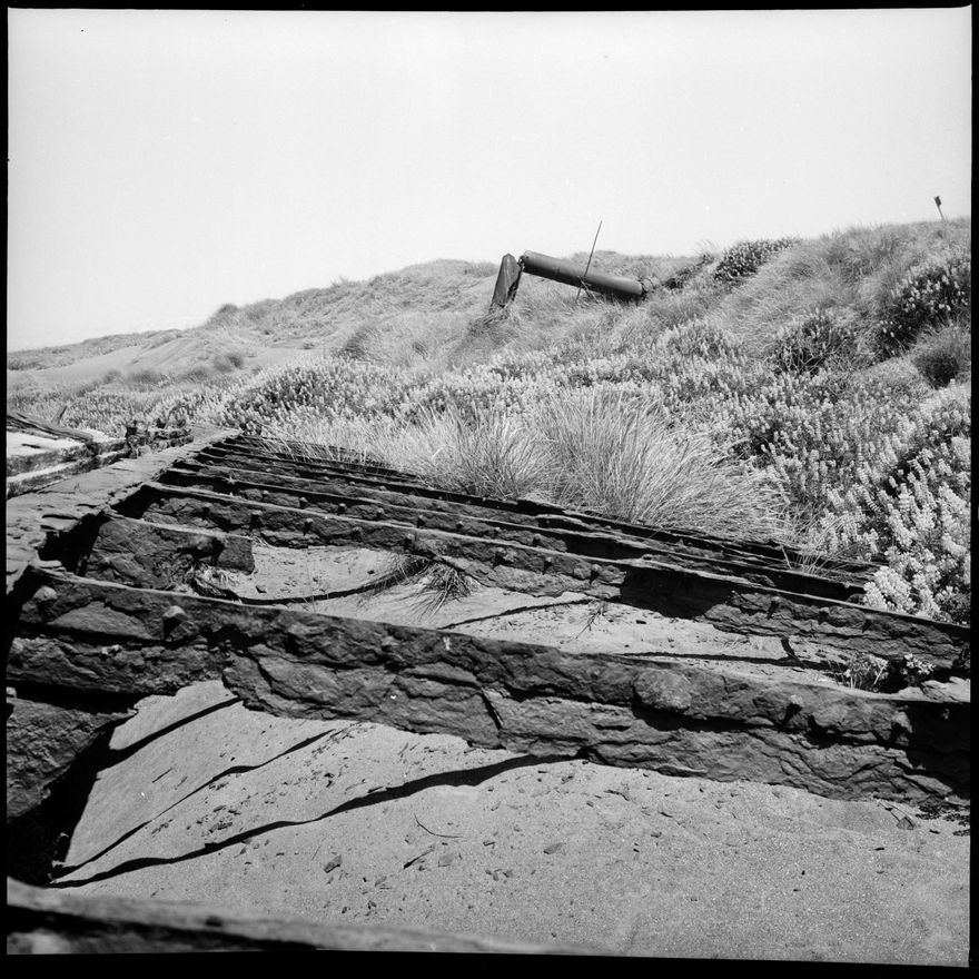 This image was taken for a story that ran in The Manawatu Evening Standard on 3rd December 1965 "The wreck of the barque Fusilier as she lies between the Turakina and Rangitikei Beaches. The tall mass of the ship were for years a survey point, but now they have collapsed through age and rust, the last one quite recently. On the top of the picture the build-up of sand can be seen. There the hill of the Fusilier is now lying was once high water mark. They Fusilier was beached during a gale in 1878 and two unsuccessful attempts were made to refloat the vessel."