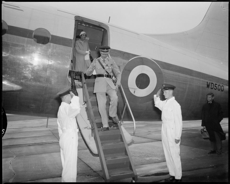 This image was taken for a story that ran in The Manawatu Evening Standard on 19 March, 1959. "In rain yesterday afternoon, an R.A.F. Hastings landed at Ohakea bringing with it General Sir Richard Hull, the Commander-in-Chief of the Far East Land Forces. He was accompanied by Lady Hull. The photograph shows the General disembarking from his aircraft."