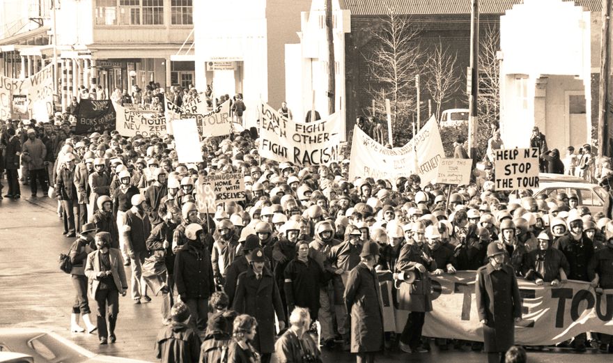 This image was taken (but not used) for a story that ran in The Manawatu Evening Standard on 01 August 1981. Extra police personnel were flown into Palmerston North in anticipation of game-day anti-Springbok Tour and anti-Apartheid protests. The Standard reported there were 1000 police, including a special riot squad, and 5000 protestors. The 1pm March culminated in a 24 minute standoff with the police lines on the corner of David and Cuba Streets.