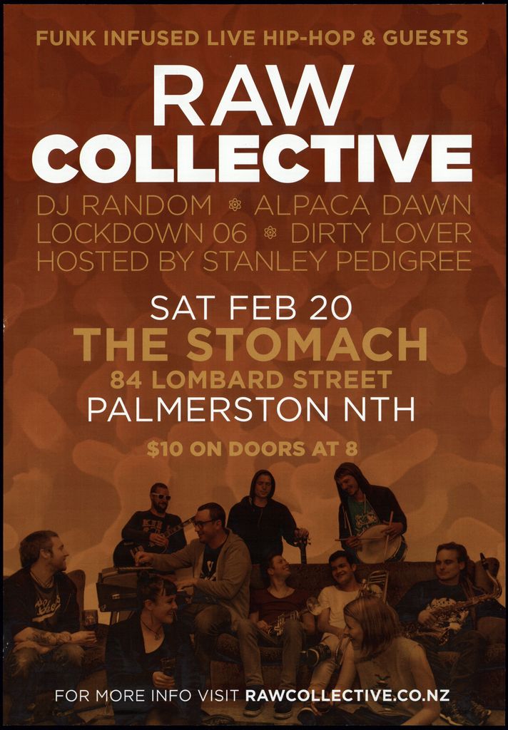 Funk infused live hip-hop & guests. Raw Collective. DJ Random. Alpaca Dawn. Lockdown 06. Dirty Lover. Hosted by Standley Pedigree. Sat Feb 20 The Stomach 84 Lombard Street Palmerston Nth. $10 on doors at 8. For more info visit rawcollective.co.nz. Part of a collection of posters that were displayed at The Stomach, Lombard Street, venue for Creative Sounds Society Incorporated.