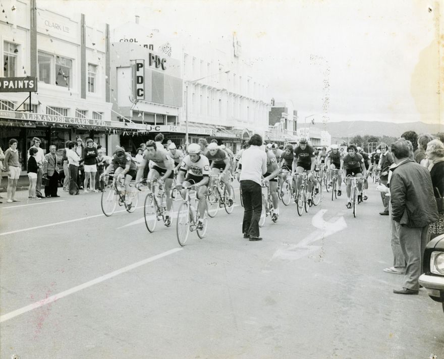 The Dulux Six-Day Cycle Race ran down the length of the North Island. The final stage was from Palmerston North to Wellington. Cyclists are shown here making their way down Fitzherbert Avenue. The man in the number 12 jersey is Roger Leaf.