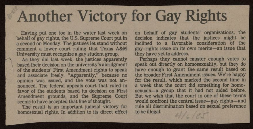 Consisting primarily of clippings from New Zealand newspapers, it covers the subjects of Homosexual Law Reform efforts, the Aids epidemic and New Zealand gay and lesbian rights movements.