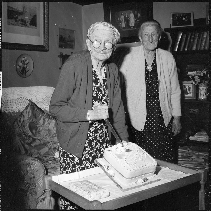 This image was taken (but not used) for a story that ran in The Manawatu Evening Standard on 19th January 1966 "Friends and relations of Miss Marion L. Squire yesterday gathered at her home at 237 Ferguson Street to celebrate her 90th birthday." [The picture shows Miss Squire cutting her birthday cake.]