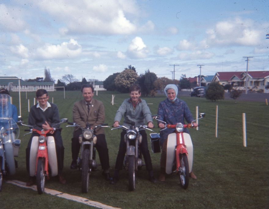 Students Fiona Binks, Ian Smith, Ray Lepper, Mark Goodwin, and Rosina Palmer at the Palmerston North Motorcycle Training School seated on their respective machines. The slalom course of poles can be seen in the background. A range of motorcycles and scooters are ridden in training.