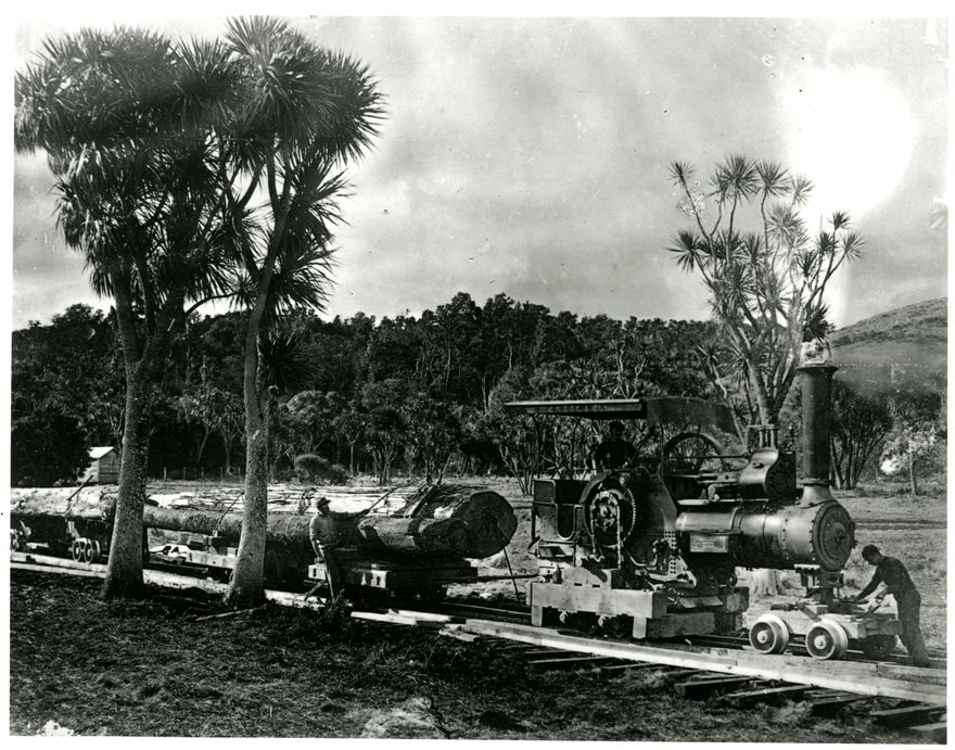 A traction engine hauling felled trees. This traction engine [ see 2014N_Stu4_009085] has been temporarily converted to run on rails. The large back wheels have been removed and a chain taken from the drive gear via chain to the wheels of the rear bogie. This bogie, like the one replacing the traction engine’s front axle, is made from heavy beams of wood to which plain metal bearings have been fixed. This arrangement suggests a solution necessitated by a lack of engineering workshops in the area, as rail bogies were normally made from iron or steel. The rails themselves are timber and unlikely to last more than a season’s felling. After the job was done the traction engine would be jacked up and the original wheels replaced after which the owner could go back to regular contract work.