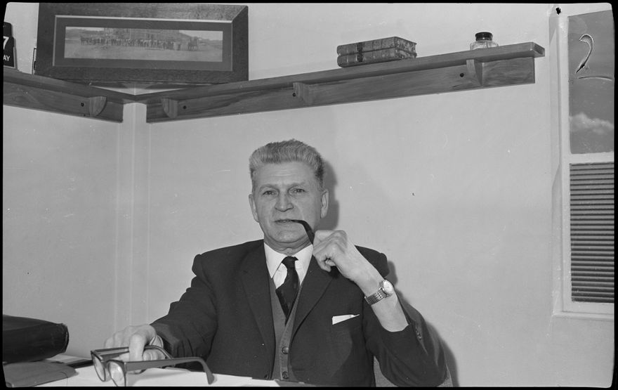 This image was taken for a story that ran in The Manawatu Evening Standard on 23 August 1960 "Mr. F.G. Haycock who, since its inception has been the chairman of directors of Steel Benders and Suppliers (P.N.) Ltd., today retired from the position. A Wellington man, Mr. Haycock has been associated with Winstone's Ltd., for the past 25 years and, although he has announced his retirement from Steel Benders and Suppliers Ltd., he will continue on the directorate of the former company in an advisory capacity. For many years Mr. Haycock has had associations with Palmerston North. He was instrumental in opening the branch of Winstone's Ltd. in this city..."