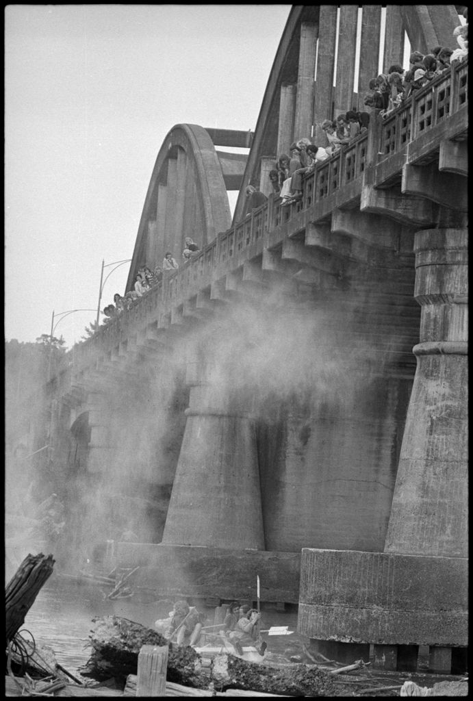 "To the victors, certainly not the spoils, but heaps of flour. As the Valuation Department team drifted under the Fitzherbert Bridge yesterday after winning the Awapuni Jaycee raft race, spectators pelted it with flour, carrots, eggs and other missiles. Bob Mitchell is seen being coated by this well-aimed flour bomb."