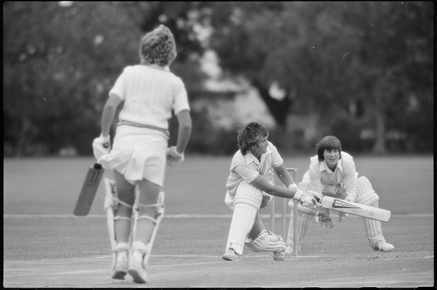 This image was taken (but not used) by the Evening Standard on 19th of January 1982. It depicts Manawatū Women’s cricket team taking on the International Australian Women’s team in a limited over warm-up match for the Hansell's Vita Fresh Women's World Cup 1981/1982. The match was held at Ongley Park in Palmerston North. The Australian team won by 202 runs. The match report ‘Aussies too polished in all facets’ was written by Ford Watson and published the next day: