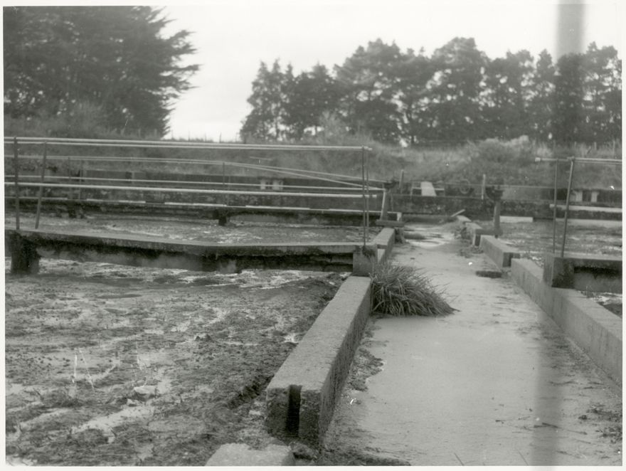 The old septic tank system at Awapuni is seen here in a derelict state, soon after being closed down in 1968. There is little growth of vegetation inside the empty tanks indicating that the date is about 1969. These septic tanks were constructed by Mr D. Burke (contractor) and at the time were the largest outside of England. The Palmerston North Borough Council the spent 38,000 pounds on the new sewage system, including the laying of the connecting series. These septic tanks originally accompanied the large filter beds located between the tanks and the Manawatu River, but these filter beds were eventually removed and over the years the plant was upgraded. These septic tanks were used until 1968 when the new ¾ million dollar plant began operation close to the original tanks.